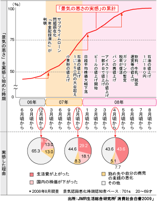 「今後の景気見通し」については、07年8月から一転して、76.5%が「悪くなる」と答えている。07年春頃からガソリン高や食品などの値上げが意識されはじめ、米国でのサブプライムローン問題を機に世界の株価の大幅な変動によって不安が増加したことやビールや食パンなど値上げによって生活費が上昇するなど実生活の変化が、景気認識悪化のきっかけになっている。