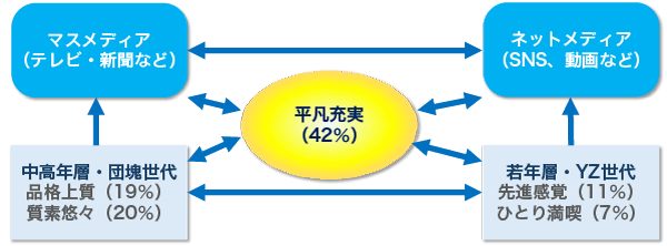 具体的には、若い世代を含む比率が多いのは、「先進感覚」と呼ばれる価値意識で括られるグループであり、高齢層を多く含むのは、「品格上質」として括られるグループである。つまり、世代対立のように見える現象は、深部では、価値観の差による。特に、「未来」と「利他」の選好に関しては、先進感覚は、「現在」に、そして、「利己」の価値に重点を置く、対して「品格上質」は、「未来」と「利他」である。