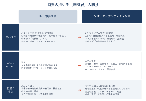 量子力学において、エンタングルメントとは、ふたつの粒子の状態が独立に記述できず、一方の測定が他方の状態を規定する関係である。消費市場において、これに対応するのは、欲望の相互依存性である。消費者Aの欲望は消費者Bの欲望と独立ではなく、他者が欲しいものを欲しいという「共犯関係」(ジラールの模倣欲望)で結ばれている。個々の消費者を独立した粒子として扱う古典的市場モデルは、この「もつれ」を捨象している。不安消費の時代には、この「もつれ」はバブル崩壊の記憶を世代に刻印し、消費抑制マインドとして35年間持続させた。時間が解決する問題ではなく、相関構造の問題であったのだ。アイデンティティ消費の時代には、この同じ「もつれ」が、「品格上質」層からマス層への連鎖的伝播として、消費拡大の方向に作用する。「孤立した個人(閉じた系)」から「もつれた個人(entangled self)」への転換が、消費の分岐点の本質である。