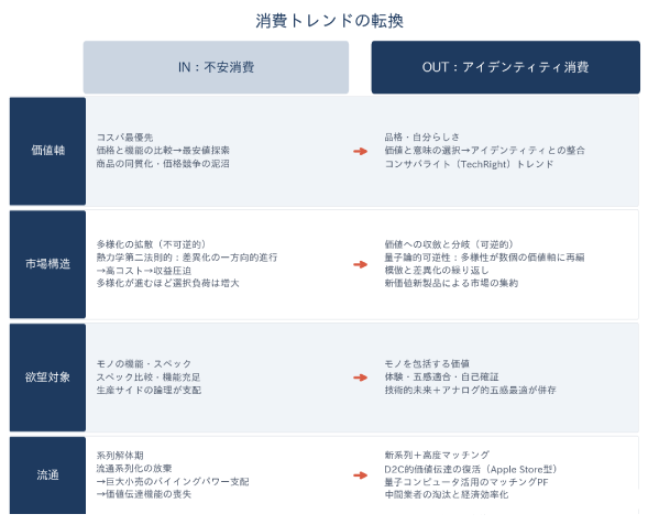 先に述べた「マクロな全体系では再帰的(recursive)な過程であり、ミクロな部分系では不可逆過程に見えるに過ぎない」という量子論的理解は、消費市場の次のレベルに対応する。個別の商品カテゴリ(部分系)を観察すれば、プロダクトライフサイクル(PLC)は導入→成長→成熟→衰退と不可逆的に進むように見える。しかし、消費文化の全体系を観察すれば、アナログオーディオの復活、フィルムカメラの再評価が示すように、衰退したはずの価値が新たな文脈で回帰する。PLCの「衰退」は終点ではなく、消費文化全体の中での位相の変化である。消費文化全体もまた、生産社会→消費社会→再び生産社会へと回帰した。しかし、それは同一平面上の反復ではなく、螺旋的に上昇する再帰である。そして2026年、再び消費主導社会へ回帰する。しかし、それは1980年代の記号消費の反復ではなく、「価値消費」という新たな位相への分岐である。これが量子論的市場観の帰結である。