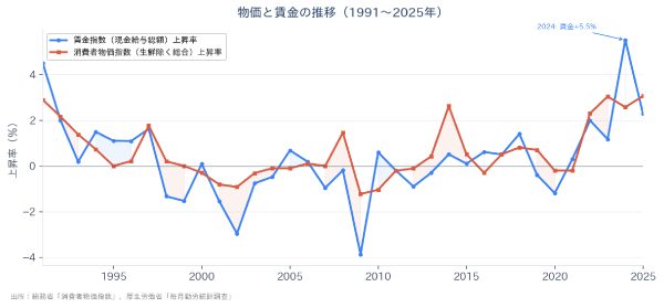 第二に、gY >2πである。名目所得成長率が物価上昇率の2倍を超えなければならないという、より厳しい条件である。現状の物価上昇率 π≈2%のもとでは、gY >4% が求められる。春闘の賃上げ率が5%台に達している大企業ではこの条件をクリアできるが、中小企業の平均賃上げ率3%台ではギリギリ届かない。