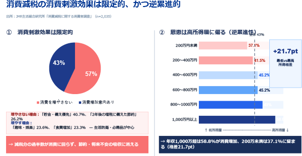 その主な結果の焦点は、減税が行われた際に、食費などの支出増に繋がるか、あるいは減税の所得が増える効果が、預貯金に回りあまり景気刺激につながらないか、である。結論は、減税が消費に向かうのは43%、預貯金に回すのが57%である。消費よりも預貯金が大きく上回る(図表2)。