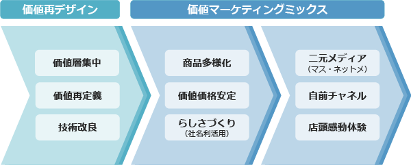 値上げで信頼を失った商品の本質的課題は、提供価値と消費者とのズレである。これを調整するには、価値を再定義しなければならない。その上で、「ブランドブック」などの作成で、価値とそのコンセプトを共有化することが、デフレマーケティング脱出の一歩だ。