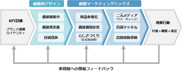 価値とは、工学的発想では、機能の集合に還元されてしまう。しかし、欲望が高度化した現在のような市場では通用しない。抽象的な生き甲斐ややり甲斐という欲望を充当する属性、機能やサービスを包括し、WTP(支払意思価格)で測定される有用性である。商品サービスはどんな価値を持っているのか、市場環境による価値の変化のなかで、自社の価値の再定義がまず必要である。ユニリーバのDoveはより抽象的に、P&Gの紙おむつはよりサービスよりに定義を変更している。