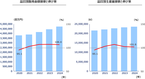 近年の市場規模推移をみると、2020年に新型コロナの影響で前年割れとなったものの、その後は右肩上がりを続け、2024年は過去最高の約4.7兆円となった。一方生産量ベースでみると、2023年以降は前年比プラスではあるもののほぼ横ばい(2024年前年比101.6%)となっており、販売金額の伸び率(2024年前年比106.4%)と比べると小さい。直近の市場拡大は単価上昇の影響が大きく、数量ベースでは頭打ちの様相がみられる(図表1)。