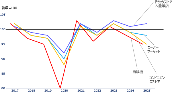 一方で、消費者の購買行動をみると、清涼飲料には大きくふたつの異なる需要が併存している。ひとつは「今すぐ飲みたい」という即時需要であり、もうひとつは「いずれ飲むために買う」ストック需要である。即時需要は利便性が価値となり、コンビニや自販機で定価販売が成立しやすい。一方、ストック需要では価格感応度が高まり、まとめ買いや割引が前提となる。