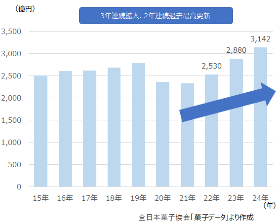 緩やかな拡大基調にあったキャンディー類の小売金額は、コロナ下の外出自粛やマスク着用で大きな打撃を受けたものの、2022年には再び拡大に転じ、3年連続の拡大、24年には3,000億円の大台に乗せ、過去最高を更新した。