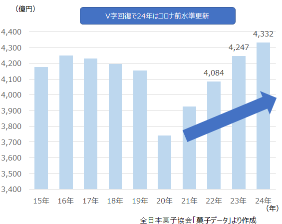 増減を繰り返してきた洋生菓子市場は、コロナ禍の外出自粛や百貨店の休業、インバウンド需要の喪失などで大きく落ち込んだが、2年で回復基調を取り戻し、2024年にはコロナ前の19年の水準を上回った。