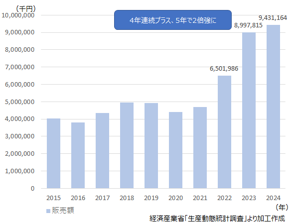 2024年の「香水・オーデコロン」の販売金額は、前年比104.8%、販売金額は初の90億円台、94億円に達し、3年連続で過去最高を更新した(経済産業省「生産動態統計調査」)。